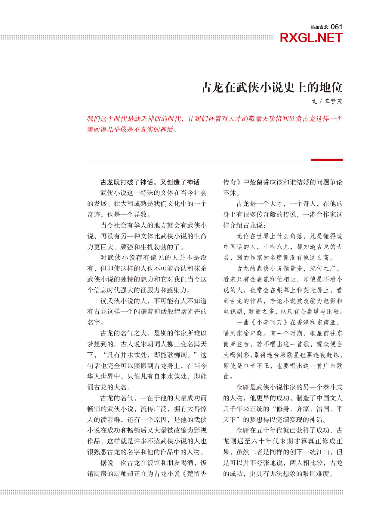 《热血古龙》第1期名家贺词